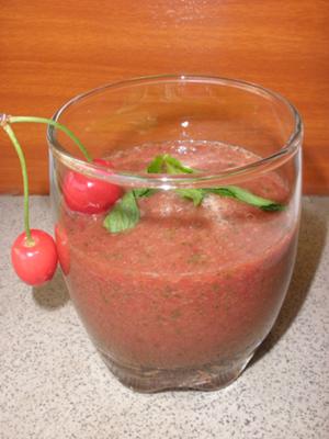 Seed the cherries and put them in the blender cup with the mint leaves and the orange juice. Blend until smooth. Serve immediately with ice cubes (or not). It is delicious, you don't need honey or nothing like that. It's sweet and fresh, all that you need for a good break.